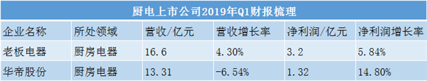厨电领域上市企业仅老板电器、华帝股份两家。老板电器在2019年第一季度共营收16.60亿元,同比增长率达4.30%;净利润实现3.20亿元,同期对比增长了5.84%;华帝股份的一季度营收达13.31亿元,营收下降了6.54%,但净利润增长了14.80%。