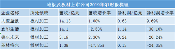地板行业上市公司共四家,大亚圣象、宜华生活、德尔未来、菲林格尔,纵观四家在2019年Q1的业绩,除了大亚圣象其余三家的净利润增长率均呈负值。营收增长率也不乐观,宜华生活和菲林格尔的营收增长分别下降,而有所增长的大亚圣象和德尔未来,增长率皆低于3%。