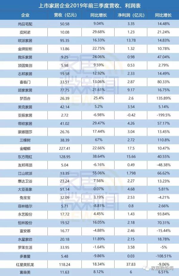 近日,2019年家居企业的前三季度报表陆续出炉。截至10月30日,对已经公布数据的31家上市公司进行了整理。一同来看看企业们的“战果”如何!